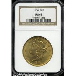<B>1904<$20> MS65 NGC.</B></I> A shimmering, impeccably preserved example that displays an even layering of reddish patina and boasts pinpoint sharpness in all areas. Outstanding quality for this otherwise common issue. <BR><BR><B>Important notice:</B> Heritage usually auctions material at the rate of 200-250 lots per hour. On some occasions eBay Live bid software or the Internet may not be able to keep up with the pace of the auction. We recommend placing a realistic absentee bid now as insurance to avoid disappointment. Occasionally the auctioneer may eliminate or reject an eBay Live bid, and the auctioneer may also reopen a lot after the close of the eBay live bidding (usually because we missed an audience bid), and may reject your bid even if it shows you as the winning bidder. By bidding via eBay Live, you agree that Heritage may award the lot to another bidder at its sole discretion under the circumstances described above or any other reasonable circumstances. Since eBay bids are not shown to us until we open the lot on the floor, we treat those bids just like floor bids. In most cases the floor responds before the eBay bid is presented to us, due to Internet lag time, so for consistency we have made it a policy that floor bids are always considered first over tie eBay live bids. Also please note that all Heritage lots purchased through eBay Live carry a 20% Buyer's Premium. Please make sure you read the Terms and Conditions before you bid. </span></font></tr></table></td></tr></table>