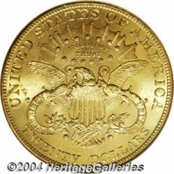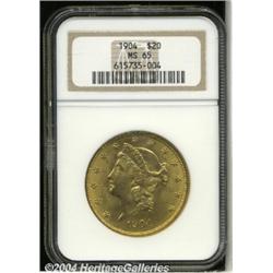 <B>1904<$20> MS65 NGC.</B></I> Very appealing fields with very pleasing lightly shimmering surfaces. Above average surfaces with only some faint handling marks visible on the obverse. <BR><BR><B>Important notice:</B> Heritage usually auctions material at the rate of 200-250 lots per hour. On some occasions eBay Live bid software or the Internet may not be able to keep up with the pace of the auction. We recommend placing a realistic absentee bid now as insurance to avoid disappointment. Occasionally the auctioneer may eliminate or reject an eBay Live bid, and the auctioneer may also reopen a lot after the close of the eBay live bidding (usually because we missed an audience bid), and may reject your bid even if it shows you as the winning bidder. By bidding via eBay Live, you agree that Heritage may award the lot to another bidder at its sole discretion under the circumstances described above or any other reasonable circumstances. Since eBay bids are not shown to us until we open the lot on the floor, we treat those bids just like floor bids. In most cases the floor responds before the eBay bid is presented to us, due to Internet lag time, so for consistency we have made it a policy that floor bids are always considered first over tie eBay live bids. Also please note that all Heritage lots purchased through eBay Live carry a 20% Buyer's Premium. Please make sure you read the Terms and Conditions before you bid. </span></font></tr></table></td></tr></table>