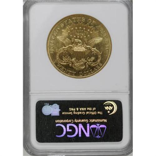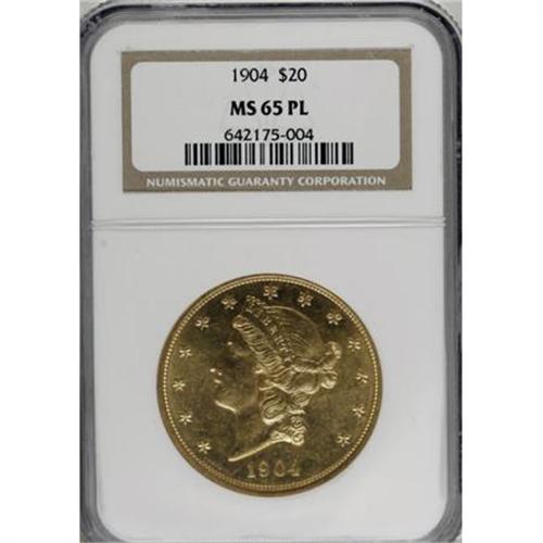 <B>1904 $20 MS65 Prooflike NGC.</B></I> This lovely Gem double eagle has fully prooflike surfaces with exceptional design details and deep yellow color. Light abrasions are typical on these large gold coins, and are somewhat magnified in the reflective surfaces, however, none are individually distracting. We cannot imagine this attractive gold piece having many peers. This issue is the most common of all double eagles, and thousands have been graded at MS65. In Gem Prooflike condition, however, the 1904 is actually rare! PCGS does not designate Prooflike twenty dollar pieces as such, and NGC has certified a mere eight coins as MS65 Prooflike, with just two pieces finer (in Prooflike), as of (11/07).<BR><I>From The New York Eye Appeal Collection, Part Three.</B></I><BR><BR><B>Coin Engraver:</B> James B. Longacre<BR><BR><b>Shipping:</b> Coins & Currency (<a target="_blank" href="http://www.heritageauctions.com/common/shipping.php">view shipping information</a>)