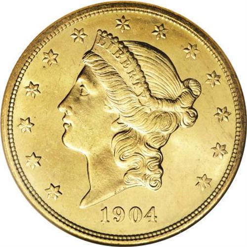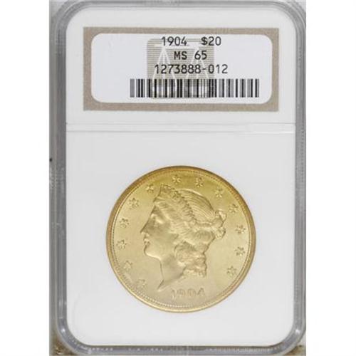 <B>1904 $20 MS65 NGC.</B></I> The fields of this Gem are semi-reflective and the luster exhibits a powerful cartwheel effect. Rich orange-gold color and impressively smooth fields combine with a decisive strike to provide pleasing eye appeal. The 1904 is a plentiful issue, but most survivors were indifferently stored and are considerably more abraded than this.<BR><BR><B>Coin Engraver:</B> James B. Longacre<BR><BR><b>Shipping:</b> Coins & Currency (<a target="_blank" href="http://www.heritageauctions.com/common/shipping.php">view shipping information</a>)
