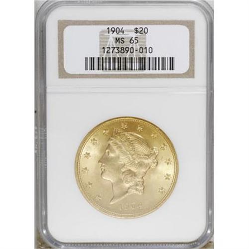 <B>1904 $20 MS65 NGC.</B></I> This twenty delivers all that one would expect from a Gem. The strike is bold, the luster is full, and the marks are scattered and minor both individually and in their cumulative impact. The color is an even honey-gold. All the elements combine to make this an exceptional representative of the issue for type purposes.<BR><BR><B>Coin Engraver:</B> James B. Longacre<BR><BR><b>Shipping:</b> Coins & Currency (<a target="_blank" href="http://www.heritageauctions.com/common/shipping.php">view shipping information</a>)