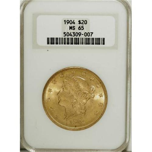 <B>1904 $20 MS65 NGC.</B></I> This lustrous yellow-gold Gem has clean fields and only a few faint grazes on the cheek. Unimportant pinpoint carbon confirms the originality. Only a tiny percentage of Liberty double eagles grade as high as MS65, and those assembling Gem gold type sets often select a 1904. Certified in a former generation holder.<BR><I>From The Florissant Collection.</B></I><BR><BR><B>Coin Engraver:</B> James B. Longacre<BR><BR><b>Shipping:</b> Coins & Currency (<a target="_blank" href="http://www.heritageauctions.com/common/shipping.php">view shipping information</a>)
