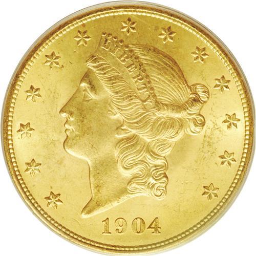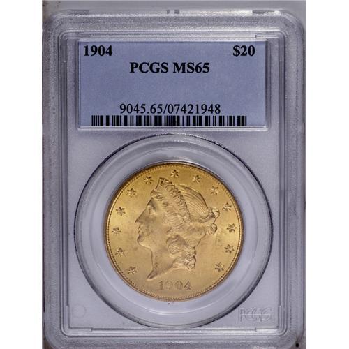 <B>1904<$20> MS65 PCGS.</B></I> The sharp striking details and shimmering full luster are typical of examples from this well produced issue. Rich, even coloration is also noted over both sides. Wispy field grazes prevent an even finer grade assessment. <BR><BR><B>Importan