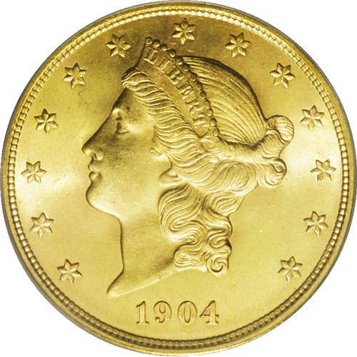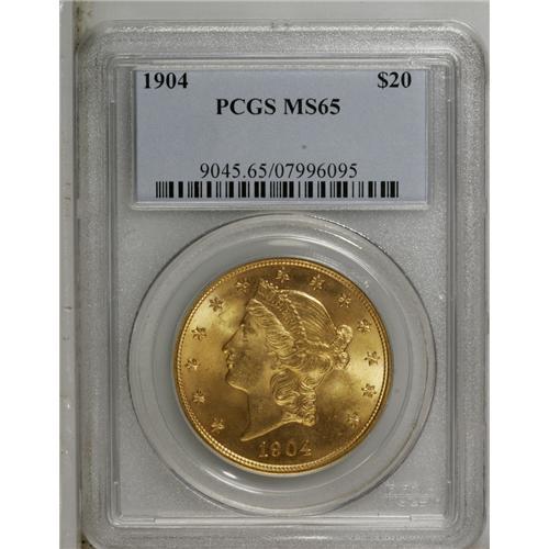 <B>1904 $20 MS65 PCGS.</B></I> A beautiful apricot-gold Gem with exceptional eye appeal, even for the demanding MS65 grade. Luster blazes across the unmarked surfaces. The right half of the horizontal shield lines and the hair behind the ear show minor incompleteness of strike, but it is unlikely that any collector will care, given the impressive preservation.<BR><BR><b>Shipping:</b> Coin/Currency (<a target="_blank" href="http://www.heritageauctions.com/common/shipping.php">view shipping information</a>)