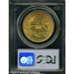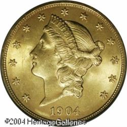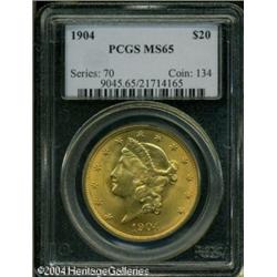 1904 $20 MS65 PCGS. A beautifully preserved aprico <B>1904 $20 MS65 PCGS.</B></I> A beautifully preserved apricot-gold Gem that possesses the bold strike and sweeping luster characteristic of the issue. While the 1904 Twenty does not appear on many dealer want lists, exemplary quality examples such as the present piece are always in demand. <BR><BR><B>Important notice:</B> Heritage usually auctions material at the rate of 200-250 lots per hour. On some occasions eBay Live bid software or the Internet may not be able to keep up with the pace of the auction. We recommend placing a realistic absentee bid now as insurance to avoid disappointment. Occasionally the auctioneer may eliminate or reject an eBay Live bid, and the auctioneer may also reopen a lot after the close of the eBay live bidding (usually because we missed an audience bid), and may reject your bid even if it shows you as the winning bidder. By bidding via eBay Live, you agree that Heritage may award the lot to another bidder at its sole discretion under the circumstances described above or any other reasonable circumstances. Since eBay bids are not shown to us until we open the lot on the floor, we treat those bids just like floor bids. In most cases the floor responds before the eBay bid is presented to us, due to Internet lag time, so for consistency we have made it a policy that floor bids are always considered first over tie eBay live bids. Also please note that all Heritage lots purchased through eBay Live carry a 20% Buyer's Premium. Please make sure you read the Terms and Conditions before you bid. This lot is being auctioned in conjunction with a live floor auction by Heritage Galleries & Auctioneers. All final auction and invoice information will be supplied by Heritage Galleries & Auctioneers, and all other information should be considered preliminary. Lot:7043