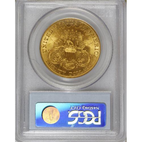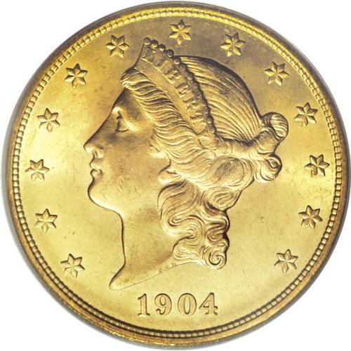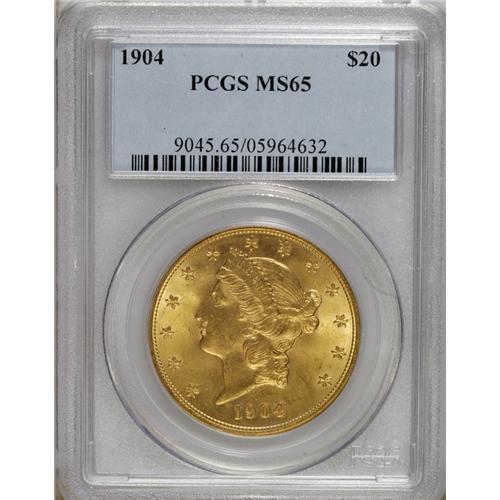 <B>1904 $20 MS65 PCGS.</B></I> A plethora of Mint State 1904 double eagles have been certified by PCGS and NGC. Even in MS65, the grade of the coin we are offering here, the two services have seen about 8,000 examples! The 1904 is thus frequently sought by type collectors. This pleasing coin exhibits dazzling luster and attractive peach-gold patination with subtle greenish undertones. A powerful strike has imparted sharp delineation to the motifs. Both sides are refreshingly clean.<BR><BR><b>Shipping:</b> Coins & Currency (<a target="_blank" href="http://www.heritageauctions.com/common/shipping.php">view shipping information</a>)