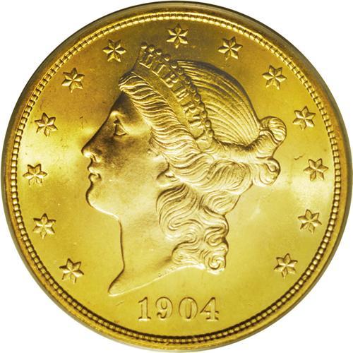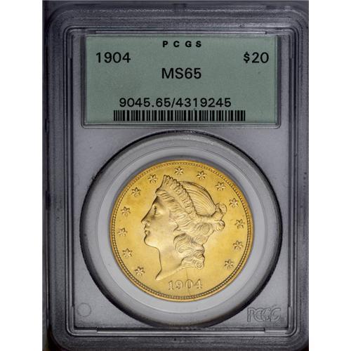 <B>1904<$20> MS65 PCGS.</B></I> A premium quality Gem example with scattered apricot patina and a compelling strike. If not for a few marks running through the shield on the reverse, this example might attain the coveted MS66 level. Housed in an older PCGS holder. <BR><BR><B>Important notice:</B> Heritage usually auctions material at the rate of 200-250 lots per hour. On some occasions eBay Live bid software or the Internet may not be able to keep up with the pace of the auction. We recommend placing a realistic absentee bid now as insurance to avoid disappointment. Occasionally the auctioneer may eliminate or reject an eBay Live bid, and the auctioneer may also reopen a lot after the close of the eBay live bidding (usually because we missed an audience bid), and may reject your bid even if it shows you as the winning bidder. By bidding via eBay Live, you agree that Heritage may award the lot to another bidder at its sole discretion under the circumstances described above or any other reasonable circumstances. Since eBay bids are not shown to us until we open the lot on the floor, we treat those bids just like floor bids. In most cases the floor responds before the eBay bid is presented to us, due to Internet lag time, so for consistency we have made it a policy that floor bids are always considered first over tie eBay live bids. Also please note that all Heritage lots purchased through eBay Live carry a 20% Buyer's Premium. Please make sure you read the Terms and Conditions before you bid. This lot is being auctioned in conjunction with a live floor auction by Heritage Galleries & Auctioneers. All final auction and invoice information will be supplied by Heritage Galleries & Auctioneers, and all other information should be considered preliminary. Lot:4477 <BR><BR><B>Winning Notification and Billing:</B> After the FINAL session in this auction is complete, Heritage will send e-mail and snail mail invoices. This process normally takes several days. All final auction and invoice information will be supplied by Heritage Galleries & Auctioneers, and all other information should be considered preliminary. <BR><BR>This auction will be conducted on a live auction floor and over the Internet through eBay Live. If you choose to place an absentee bid, please take a moment to <font color='#0000ff'><u><a href='http://pages.ebay.com/liveauctions/help/before/laabsentee.html'>learn how eBay Live absentee bidding works</a></u></font><font color='#000000'>