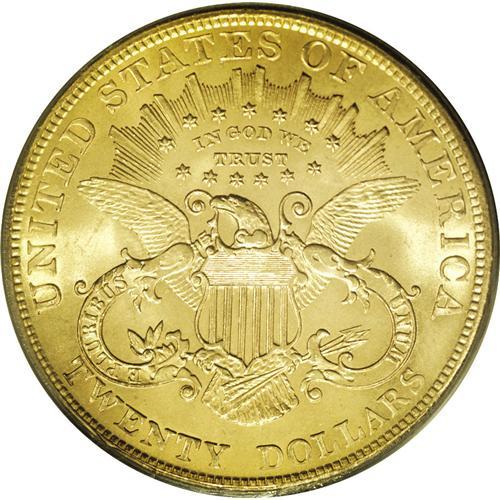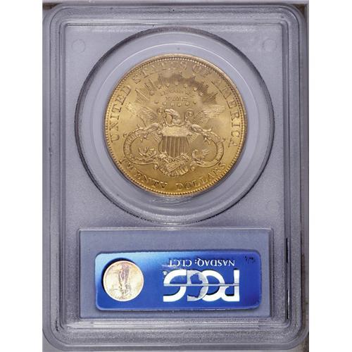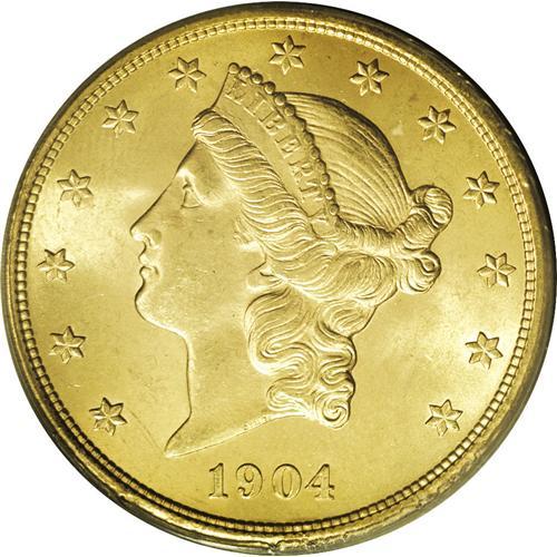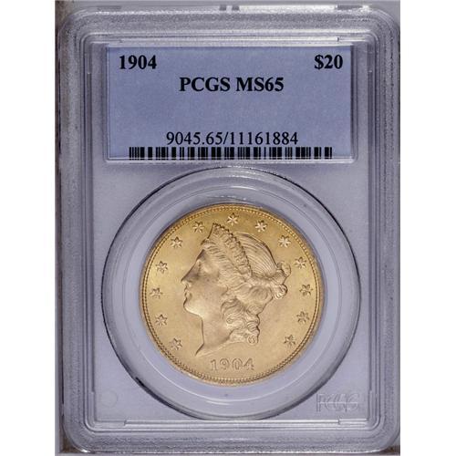 <B>1904<$20> MS65 PCGS.</B></I> A smooth and pleasing Gem of this gold type favorite. Crisply struck on both the stars and the shield lines. A couple of minor marks on Liberty's cheek serve to limit the grade. The 1904 is familiar to bourse floor participants, but high quality pieces are always desired.