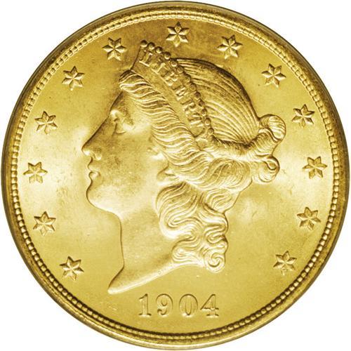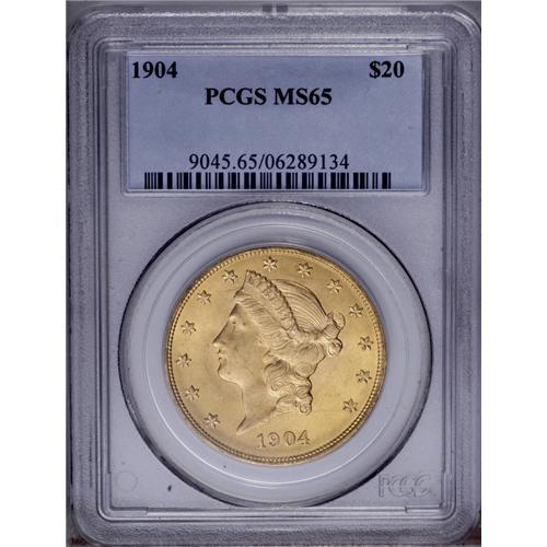 <B>1904<$20> MS65 PCGS.</B></I> An exquisite Liberty double eagle that is virtually flawless. The green-gold surfaces are smooth and exude a silky mint sheen that rolls around the coin unimpeded by contact marks. An exceptional gold type coin.