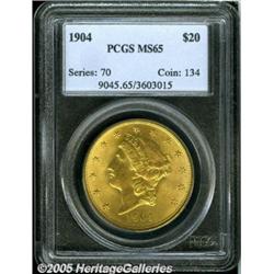 <B>1904 $20 MS65 PCGS.</B></I> Fully struck with glowing mint frost over each side and subtly patinated with an intermingling of orange-gold and lilac coloration. Noticeably free from post-striking impairments.