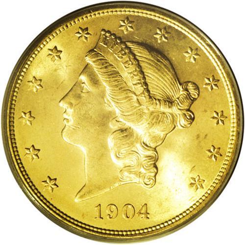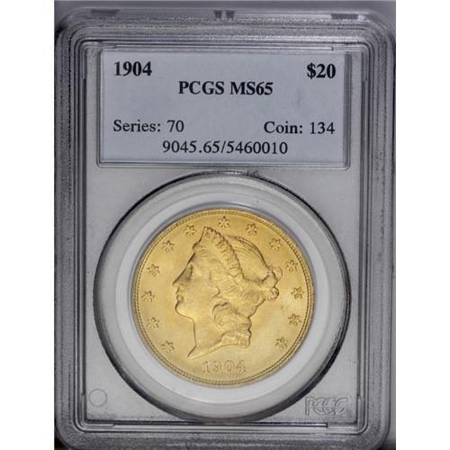 <B>1904<$20> MS65 PCGS.</B></I> Rich orange toning and impressively smooth fields combine with a decisive strike to provide pleasing eye appeal. Faint contact on the cheek can only be detected upon careful inspection with a lens. The 1904 is a plentiful issue, but most survivors were indifferently stored and are considerably more abraded.<BR><I>From The Hamburg-Sonoma Collection.</B></I>