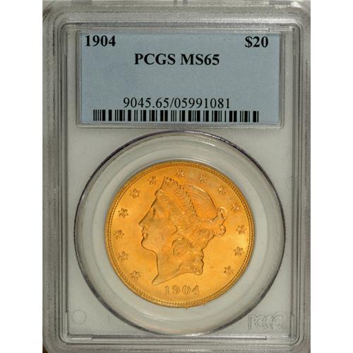 <B>1904 $20 MS65 PCGS.</B></I> This is a lovely Gem specimen with rich and satiny orange-gold luster. The surfaces are lightly marked, consistent with the grade. The population of this date in Gem quality is greater than the combined population of all other dates. It is the most common of all Liberty Head double eagles, a great choice for collectors of coinage designs.<BR><BR><b>Shipping:</b> Coin/Currency (<a target="_blank" href="http://www.heritageauctions.com/common/shipping.php">view shipping information</a>)