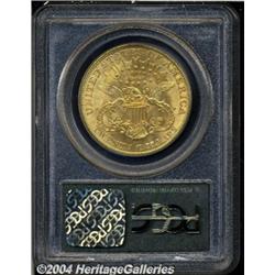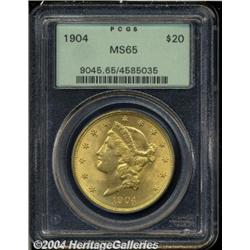 <B>1904<$20> MS65 PCGS.</B></I> The sparkling, lustrous surfaces are fully defined and show no singularly mentionable abrasions on either side. Soft mint-green patina is also noted overall.<BR><I>From The Greenwich Collection, Part One.</B></I> <BR><BR><B>Important notice:</B> Heritage usually auctions material at the rate of 200-250 lots per hour. On some occasions eBay Live bid software or the Internet may not be able to keep up with the pace of the auction. We recommend placing a realistic absentee bid now as insurance to avoid disappointment. Occasionally the auctioneer may eliminate or reject an eBay Live bid, and the auctioneer may also reopen a lot after the close of the eBay live bidding (usually because we missed an audience bid), and may reject your bid even if it shows you as the winning bidder. By bidding via eBay Live, you agree that Heritage may award the lot to another bidder at its sole discretion under the circumstances described above or any other reasonable circumstances. Since eBay bids are not shown to us until we open the lot on the floor, we treat those bids just like floor bids. In most cases the floor responds before the eBay bid is presented to us, due to Internet lag time, so for consistency we have made it a policy that floor bids are always considered first over tie eBay live bids. Also please note that all Heritage lots purchased through eBay Live carry a 20% Buyer's Premium. Please make sure you read the Terms and Conditions before you bid.
