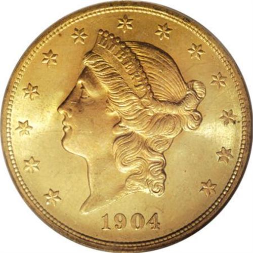 <B>1904 $20 MS65 PCGS.</B></I> Rich lime-green fields cede to orange centers. An attentively struck and impressively unblemished Gem, ideal for a high quality gold type set. The reverse is particularly smooth for the grade. Certified in a green label holder.<BR><BR><b>Shipping:</b> Coins & Currency (<a target="_blank" href="http://www.heritageauctions.com/common/shipping.php">view shipping information</a>)