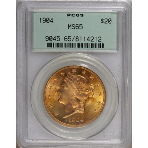 <B>1904 $20 MS65 PCGS.</B></I> Vibrant cartwheel luster and deep, variegated coloration are seen on both sides of this lovely Gem. Surface marks are minimal. The 1904 is the most ubiquitous of all double eagle issues, and is therefore an ideal selection for type purposes. Encapsulated in an older green label holder. <BR> <BR><BR><B>Coin Engraver:</B> James B. Longacre<BR><BR><b>Shipping:</b> Coins & Currency (<a target="_blank" href="http://www.heritageauctions.com/common/shipping.php">view shipping information</a>\)