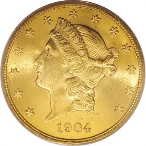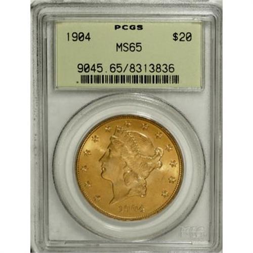<B>1904 $20 MS65 PCGS.</B></I> Sharply struck with powerful luster and excellent eye appeal. The yellow-orange surfaces of this delightful type representative are carefully preserved, and a single mark on Liberty's neck is the only mentionable flaw on the devices. An enticing example that has clearly superior quality to the Choice examples found more often on the market.<BR><BR><B>Coin Engraver:</B> James B. Longacre<BR><BR><b>Shipping:</b> Coins & Currency (<a target="_blank" href="http://www.heritageauctions.com/common/shipping.php">view shipping information</a>\)