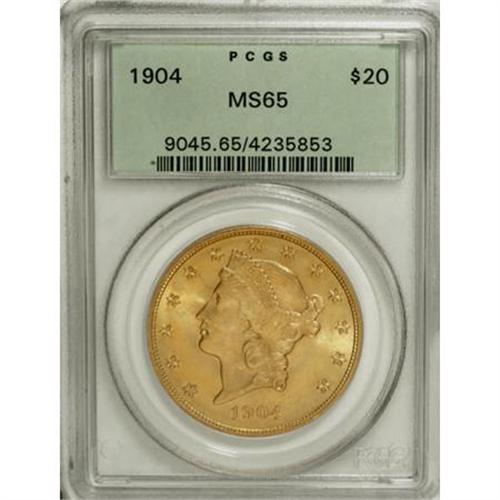 <B>1904 $20 MS65 PCGS.</B></I> A well struck and unquestionably original green-gold Type Three representative. Precisely struck, and the fields are remarkably clean for an Uncirculated Liberty twenty. Minor die ejection spreading is noted on a portion of IN GOD WE TRUST. Housed in a green label holder.<BR><I>From The Carlton Woods Collection.</B></I><BR><BR><B>Coin Engraver:</B> James B. Longacre<BR><BR><b>Shipping:</b> Coins & Currency (<a target="_blank" href="http://www.heritageauctions.com/common/shipping.php">view shipping information</a>\)
