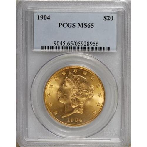 <B>1904 $20 MS65 PCGS.</B></I> Jeff Garrett and Ron Guth (2006) say of the 1904 double eagle that it "... is by far the most common date of the series." PCGS/NGC population data would certainly corroborate this, as tens of thousands have been certified. The orange-gold surfaces of this flashy Gem yield dazzling luster, and exhibit sharply struck design elements. Both faces are devoid of significant marks. This is a wonderful high-grade type example.<BR><BR><B>Coin Engraver:</B> James B. Longacre<BR><BR><b>Shipping:</b> Coins & Currency (<a target="_blank" href="http://www.heritageauctions.com/common/shipping.php">view shipping information</a>)