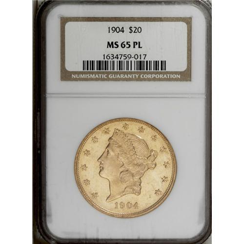 <B>1904 $20 MS65 Prooflike NGC.</B></I> The fields of this canary-gold Gem are flashy, and give the piece impressive eye appeal. The strike is bold throughout, even on Liberty's curls behind the ear, which often show softness. 1904 is one of the few years in the double eagle series that the Philadelphia Mint output exceeded its San Francisco counterpart.<BR><BR><b>Shipping:</b> Coin/Currency (<a target="_blank" href="http://www.heritageauctions.com/common/shipping.php">view shipping information</a>)
