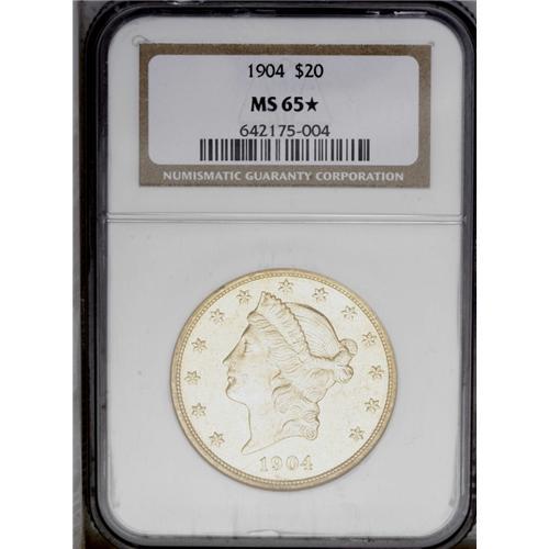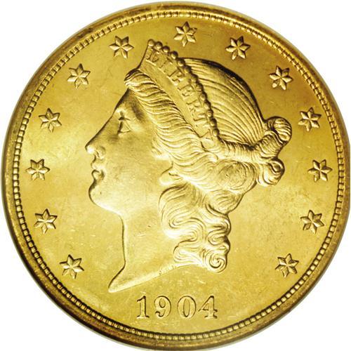 <B>1904<$20> MS65 <img border='0' src='http://www.heritagecoins.com/images/star.gif' width=10 height=10> NGC.</B></I> Although not designated as such, this lovely Gem double eagle has fully prooflike surfaces with exceptional design details and deep yellow color. Light abrasions are typical on these large gold coins, and are somewhat magnified in the reflective surfaces, however, none are individually distracting. We cannot imagine this lovely gold piece having many peers.