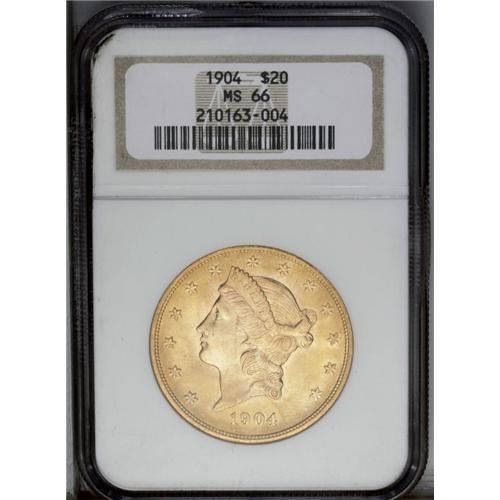 <B>1904 $20 MS66 NGC.</B></I> Among the chores of professional coin catalogers is to describe-- hopefully with some level of enthusiasm and reader interest--the many, many 1904 double eagles that appear in a typical major auction. This date's omnipresence is completely unsurprising, as more than 6 million pieces were coined, and it appears that most were shipped overseas for banking transactions. This removal from the channels of domestic commerce ensured an ample supply of Mint State specimens for future generations of collectors. However, one look at this phenomenal example will tell the astute viewer that this is not just another pedestrian specimen of the most common Liberty double eagle. Quite the contrary, this stunning type coin more closely resembles a high grade Morgan dollar in terms of its impact and eye appeal, except, of course, that it is gold! Luscious and abundant cartwheel luster is the hallmark of this coin, although mention must be made of the pristine surfaces and gorgeous, deep orange-gold color. A generous strike completes the package. Do the math: Of the more than 290,000 certified examples, <I>this piece grades finer than 99.903% of the total population!</B></I> There are three pieces graded finer at NGC and PCGS combined (10/06).<BR><BR><b>Shipping:</b> Coin/Currency (<a target="_blank" href="http://www.heritageauctions.com/common/shipping.php">view shipping information</a>)