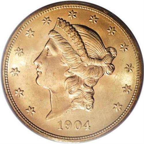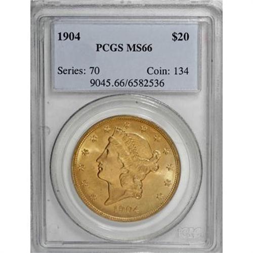 <B>1904 $20 MS66 PCGS.</B></I> A delicate mix of apricot-gold and mint-green color rests on the highly lustrous surfaces of this lovely Premium Gem, and a solid strike emboldens the design features, thus adding to the coin's outstanding eye appeal. Both sides are well preserved. This readily available date is eagerly sought by type collectors.<BR><BR><B>Coin Engraver:</B> James B. Longacre<BR><BR><b>Shipping:</b> Coins & Currency (<a target="_blank" href="http://www.heritageauctions.com/common/shipping.php">view shipping information</a>\)