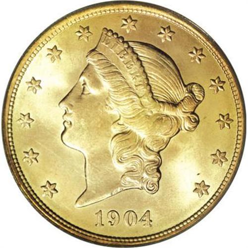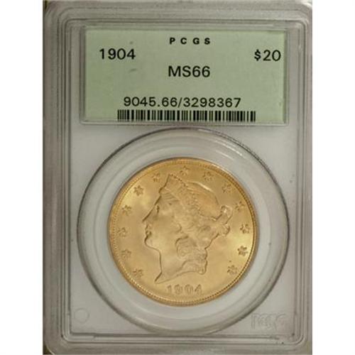 <B>1904 $20 MS66 PCGS.</B></I> The ultimate Type Three Liberty Head double eagle, the 1904 P-mint was produced to the extent of more than 6 million examples, and the San Francisco Mint contributed more than 5 million pieces to what was almost certainly a glut of gold coins at the time. Fortunately for collectors a century later, glorious examples such as the present piece exist all the way up to Superb Gem Mint State. The present piece is best by only two pieces at PCGS (12/07), with wonderful orange-gold surfaces tinged with green, marvelous luster, and tremendous eye appeal. Certified in a green-label holder.<BR><BR><B>Coin Engraver:</B> James B. Longacre<BR><BR><b>Shipping:</b> Coins & Currency (<a target="_blank" href="http://www.heritageauctions.com/common/shipping.php">view shipping information</a>)