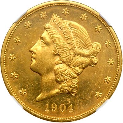 1904 $20. NGC graded MS-62 Prooflike PQ. Mesmerizing golden toning coupled with flashy prooflike surfaces makes this coin quite desirable.