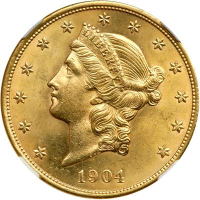 1904 $20. NGC graded MS-62. Nice light golden toning.