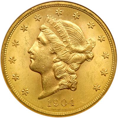 1904 $20. NGC graded MS-63. A nice frosty Uncirculated coin. There is a short diagonal mark on the jaw.