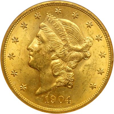 1904 $20. NGC graded MS-63. Rich golden toning. A couple minute reverse copper spots as well as some obverse bagmarks on the face.