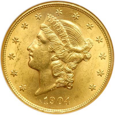 1904 $20. NGC graded MS-63. Lovely golden hues are displayed on both sides. A choice, attractive appearling Lib $20.
