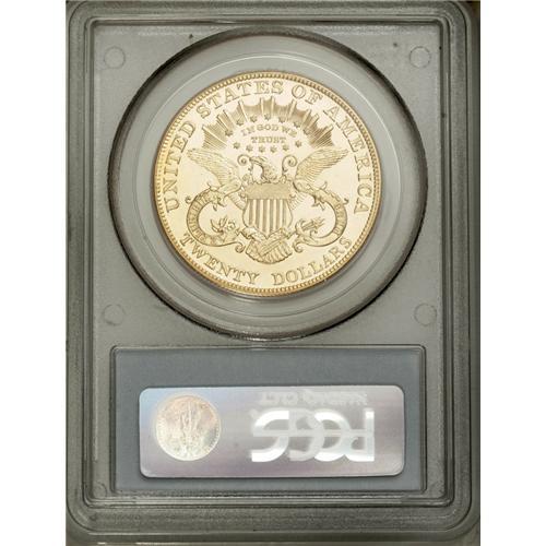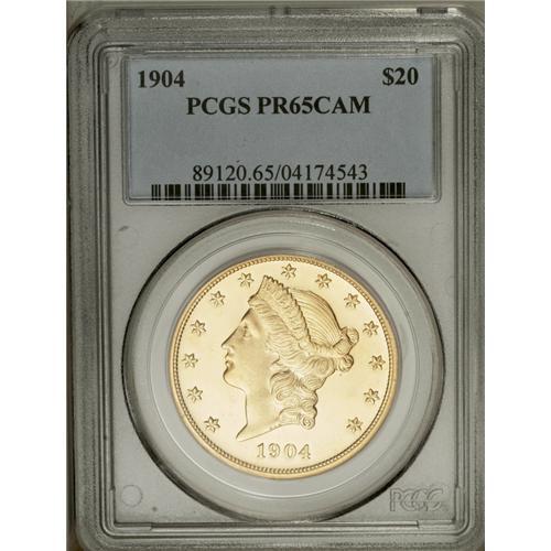 <B>1904<$20> PR65 Cameo PCGS.</B></I> Although the 1904 Liberty double eagle is the single most common date in the series in business strike format, proofs of this date are just as rare as any other date in the last decade of this design. Only 98 of these proofs were coined, and a little more than half that number still exist today.<BR> When Walter Breen penned his <I>Proof Coin Encyclopedia,</B></I> he included die characteristics for many of the proof coinage issues. For example, he described the obverse as: "Date to right, slanting down; left base of 1 barely right of left edge, right base of 4 right of center of dentils." The example that we are offering appears to be different, with the left base of 1 about over center of a dentil and the right base of 4 nearly over the right edge of a dentil. It is possible that the different positions may actually be a result of differing perspectives on the part of individual viewers. The date clearly appears to slant down to the right. A tiny area of polish is visible just above Liberty's earlobe, with swirling die polishing lines in that area. The reverse is from the new hub of 1900, with a smooth curve to the back of the eagle's neck. The old hub features feathers that protruded into the field.<BR> This is a nearly flawless Gem with bright yellow-gold color and excellent contrast. The fields are deeply mirrored with satiny luster on the devices. The design motifs are nicely frosted, unlike most proofs from this period that had polished devices. This example is a glittering jewel that completely lacks identifying characteristics. Only a few faint hairlines limit the grade. Population: 7 in 65 Cameo, 0 finer (7/06).<BR><I>From The Mulholland Collection.</B></I>