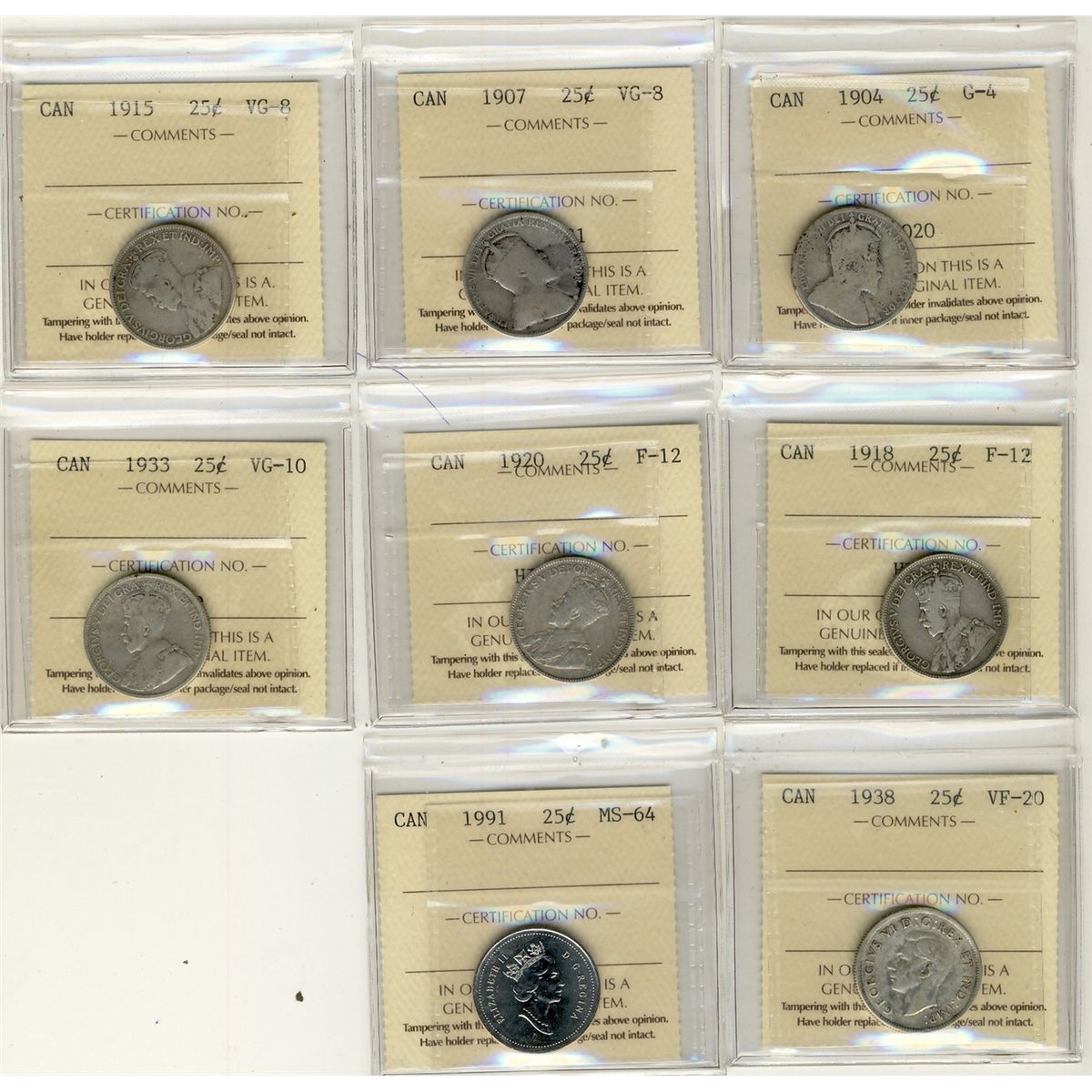1904 25¢, 1907, 1915, 1918, 1920, 1933 & 1938. Also includes 1991 25¢ MS64. Lot of 7 ICCS pcs G4 to VG10 with exception of 1938 VF.