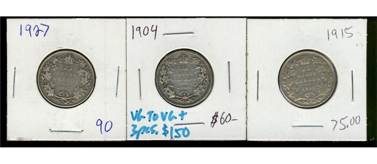 1904 25¢, 1915 & 1927. Lot of 3 key dates VG to VG+.