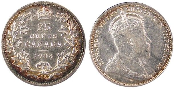 1904 25¢ ICCS EF40. Attractive but light rim tones with strong lustre.