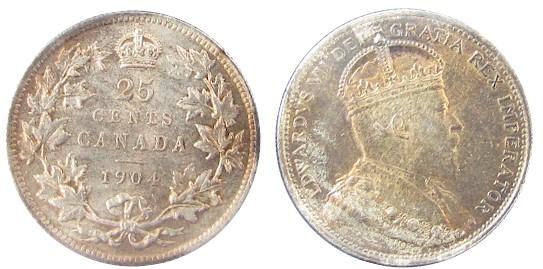 1904 25¢ ICCS MS62PQ, attractive russet tones over full original lustre. A rare date.