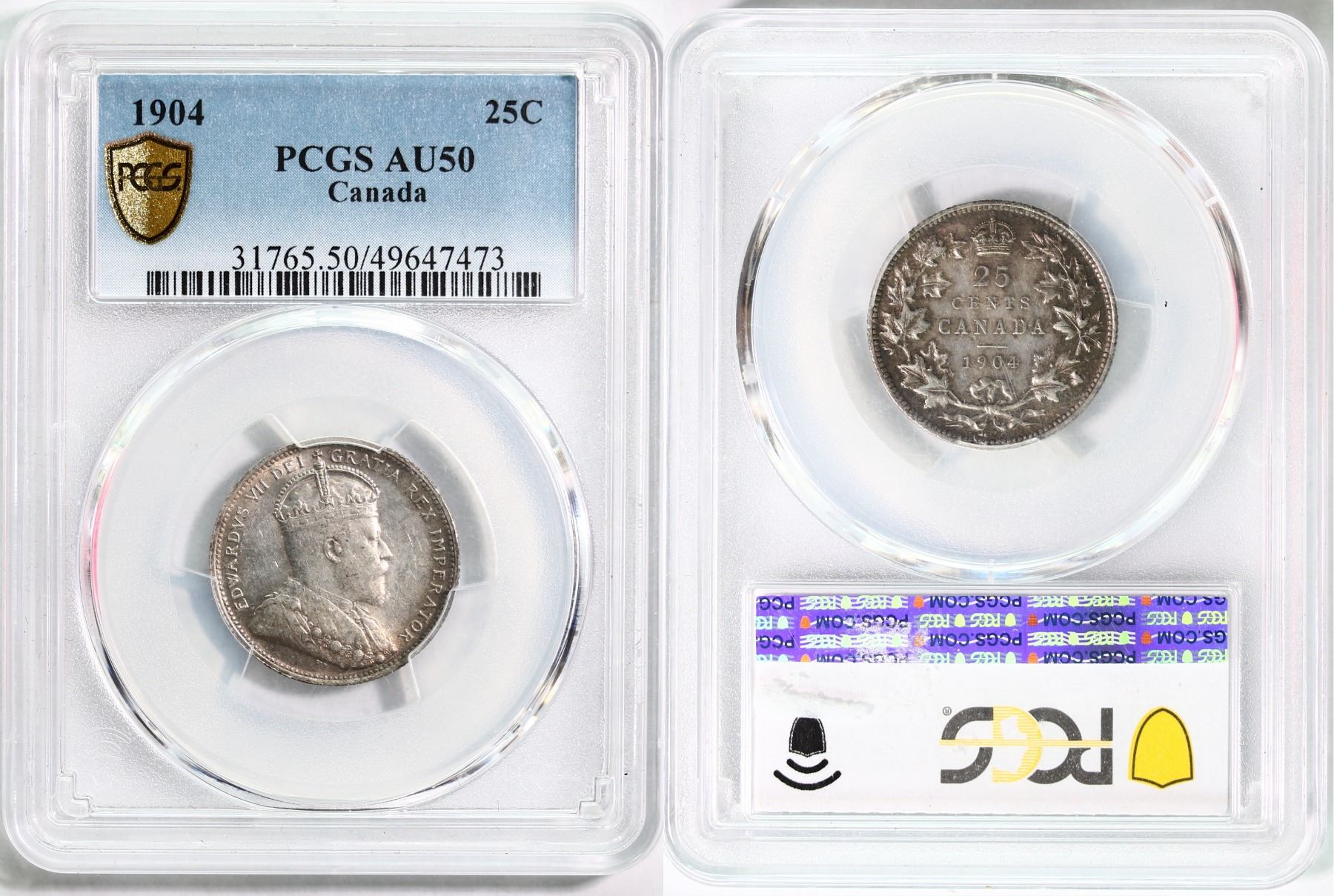 1904 25¢ PCGS About Uncirculated-50 Lustrous with light toning. Scarce date.