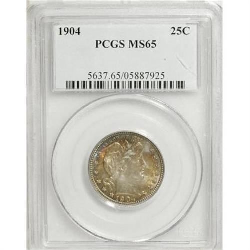 <B>1904 25C MS65 PCGS.</B></I> Brilliant centers with vivid sapphire, peach, and gold-orange patina at the margins. This strongly lustrous and solidly struck Gem offers excellent eye appeal. Population: 15 in 65, 8 finer (12/07).<BR><BR><B>Coin Engraver:</B> Charles E. Barber<BR><BR><b>Shipping:</b> Coins & Currency (<a target="_blank" href="http://www.heritageauctions.com/common/shipping.php">view shipping information</a>)