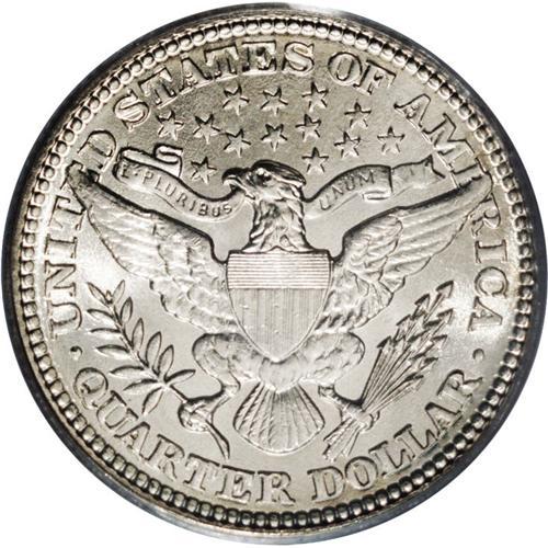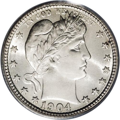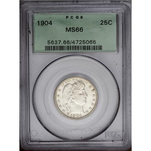 <B>1904<25C> MS66 PCGS.</B></I> Booming luster bathes this sharply struck and carefully preserved Premium Gem. Light gold toning is nearly imperceptible. A tiny spot is noted at 2 o'clock, and the shield possesses a few minor marks. Encapsulated in a green label holder. Population: 7 in 66, 1 finer (2/06).