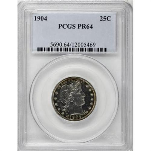 <B>1904 25C PR64 PCGS.</B></I> Light cameo contrast is noted on both sides, though not enough to merit full Cameo designation. The obverse shows light peripheral toning which is more dominant on the reverse, with rich shades of lime-green, electric blue, and magenta. Some light hairline scratches are noted in the fields, but the overall look is very attractive.<BR><BR><B>Coin Engraver:</B> Charles E. Barber<BR><BR><b>Shipping:</b> Coins & Currency (<a target="_blank" href="http://www.heritageauctions.com/common/shipping.php">view shipping information</a>)