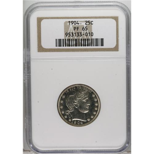 <B>1904 25C PR65 NGC.</B></I> The 1904 quarters had a relatively low mintage of 670 pieces, but a goodly number have been certified (about 410 pieces, most through PR64); a number are likely resubmissions. This Gem is exquisitely struck, and exhibits mild cameo tendencies when the coin is tilted under a light source. Untoned and well preserved.<BR><BR><b>Shipping:</b> Coins & Currency (<a target="_blank" href="http://www.heritageauctions.com/common/shipping.php">view shipping information</a>)
