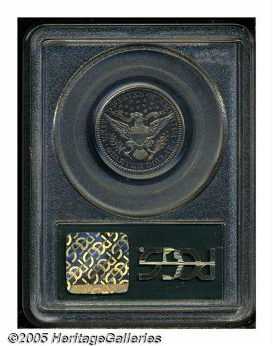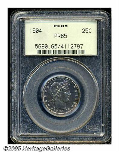 <B>1904<25C> PR65 PCGS.</B></I> Vivid sea-green and rose-gold colors are revealed when this intricately struck Gem is rotated beneath a light. A small obverse spot at 4 o'clock, otherwise a splendid older holder specimen. A scant 670 pieces were struck. Population: 28 in 65, 36 finer (5/05).