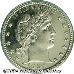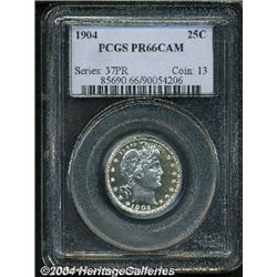 <B>1904<25C> PR66 Cameo PCGS.</B></I> Untoned, or essentially so, with fully brought up devices set apart from glassy fields. While the business strike 1904 is a popular coin for type purposes, we caution bidders that the similarly dated proof boasts a low certified population at the present level. Combined NGC and PCGS Population: 9 in PR66 Cameo, only two are finer with this finish (9/04). <BR><BR><B>Important notice:</B> Heritage usually auctions material at the rate of 200-250 lots per hour. On some occasions eBay Live bid software or the Internet may not be able to keep up with the pace of the auction. We recommend placing a realistic absentee bid now as insurance to avoid disappointment. Occasionally the auctioneer may eliminate or reject an eBay Live bid, and the auctioneer may also reopen a lot after the close of the eBay live bidding (usually because we missed an audience bid), and may reject your bid even if it shows you as the winning bidder. By bidding via eBay Live, you agree that Heritage may award the lot to another bidder at its sole discretion under the circumstances described above or any other reasonable circumstances. Since eBay bids are not shown to us until we open the lot on the floor, we treat those bids just like floor bids. In most cases the floor responds before the eBay bid is presented to us, due to Internet lag time, so for consistency we have made it a policy that floor bids are always considered first over tie eBay live bids. Also please note that all Heritage lots purchased through eBay Live carry a 20% Buyer's Premium. Please make sure you read the Terms and Conditions before you bid.