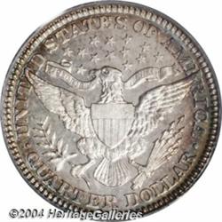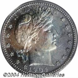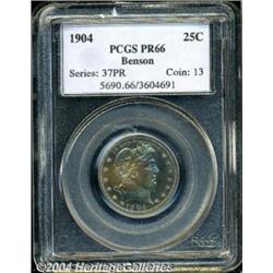 <B>1904<25C> PR66 PCGS.</B></I> Ex: Benson. Bands of aquamarine, ocean-blue, peach, and rose-red colors invigorate the obverse, while the reverse is brilliant aside from peripheral accents of lemon, golden-brown, and electric-blue patina. This needle-sharp premium Gem is lovingly preserved and worthy of an exceptional specialized collection. Only 670 pieces were issued. Population: 27 in 66, 11 finer (3/04).<BR><I>Ex: Benson Collection, Part II (Ira & Larry Goldberg, 2/02), lot 787, which realized $6,325.</B></I><BR><I>From the JFS Collection.</B></I> <BR><BR><B>Important notice:</B> Heritage usually auctions material at the rate of 200-250 lots per hour. On some occasions eBay Live bid software or the Internet may not be able to keep up with the pace of the auction. We recommend placing a realistic absentee bid now as insurance to avoid disappointment. Occasionally the auctioneer may eliminate or reject an eBay Live bid, and the auctioneer may also reopen a lot after the close of the eBay live bidding (usually because we missed an audience bid), and may reject your bid even if it shows you as the winning bidder. By bidding via eBay Live, you agree that Heritage may award the lot to another bidder at its sole discretion under the circumstances described above or any other reasonable circumstances. Since eBay bids are not shown to us until we open the lot on the floor, we treat those bids just like floor bids. In most cases the floor responds before the eBay bid is presented to us, due to Internet lag time, so for consistency we have made it a policy that floor bids are always considered first over tie eBay live bids. Also please note that all Heritage lots purchased through eBay Live carry a 20% Buyer's Premium. Please make sure you read the Terms and Conditions before you bid. </span></font></tr></table></td></tr></table>