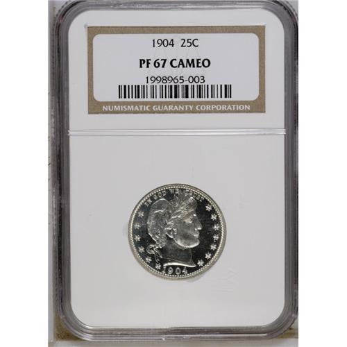 <B>1904 25C PR67 Cameo NGC.</B></I> This fully brilliant Superb Gem has unbroken cameo frost throughout the devices. The glassy fields lack evidence of hairlines or lint marks. 670 proofs were struck, but most of these have little or no contrast, since NGC has certified only 9 pieces (as of 10/06) as Cameo. Neither service has encapsulated any examples as Deep or Ultra Cameo. Census: 3 in 67, 0 finer (10/06).<BR><BR><b>Shipping:</b> Coin/Currency (<a target="_blank" href="http://www.heritageauctions.com/common/shipping.php">view shipping information</a>)