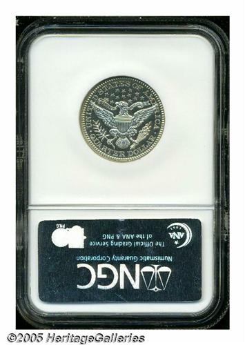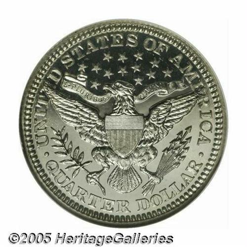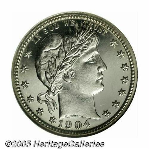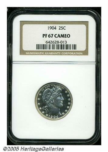 <B>1904<25C> PR67 Cameo NGC.</B></I> This is a sharply struck, Superb Proof with light contrast between the mirrored fields and lustrous devices. Both sides have brilliant surfaces with a trace of champagne color on the reverse. Cameo Proofs of this era are seldom encountered, and this one is the single finest such example certified by NGC. Population: 1 in 67, 0 finer (5/05).
