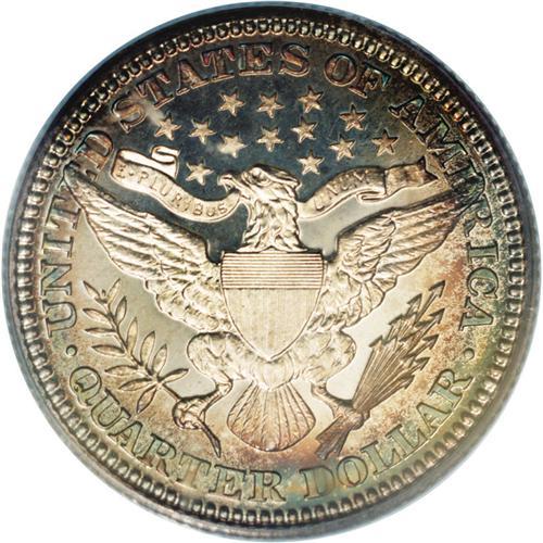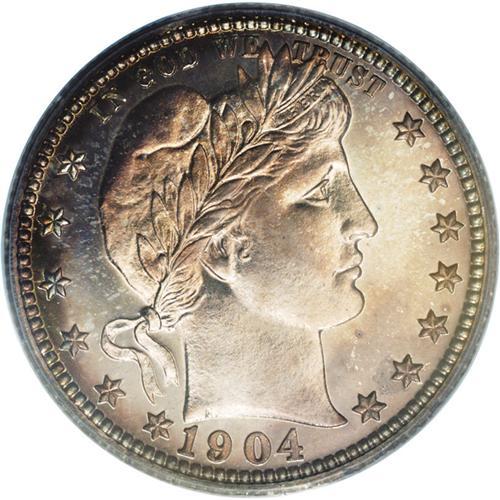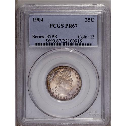 <B>1904<25C> PR67 PCGS.</B></I> Impeccable mirrored surfaces, while not credited with a Cameo designation, boast far more contrast than is generally seen on this early 20th century issue. Splotchy coppery-orange toning seems to strengthen in the peripheral areas and a small, curious dull area is noted about star 12. Population: 9 in 67, 0 finer (3/06).