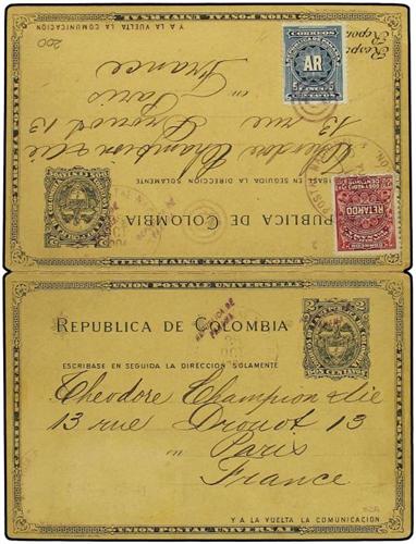 1904 2c. + 2c. postal stationery reply card of Colombia overprinted "Republica De/Panama" with additional 2½c. ´Retard´ + 5c. ´AR´ adhesives. Both halves (joined) addressed to Champion & Co, Paris. No message.