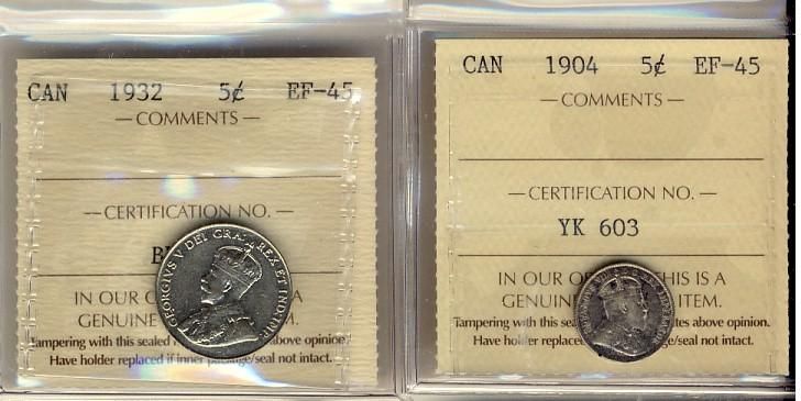 1904 5¢ & 1932 ICCS EF45. Lot of 2 coins.